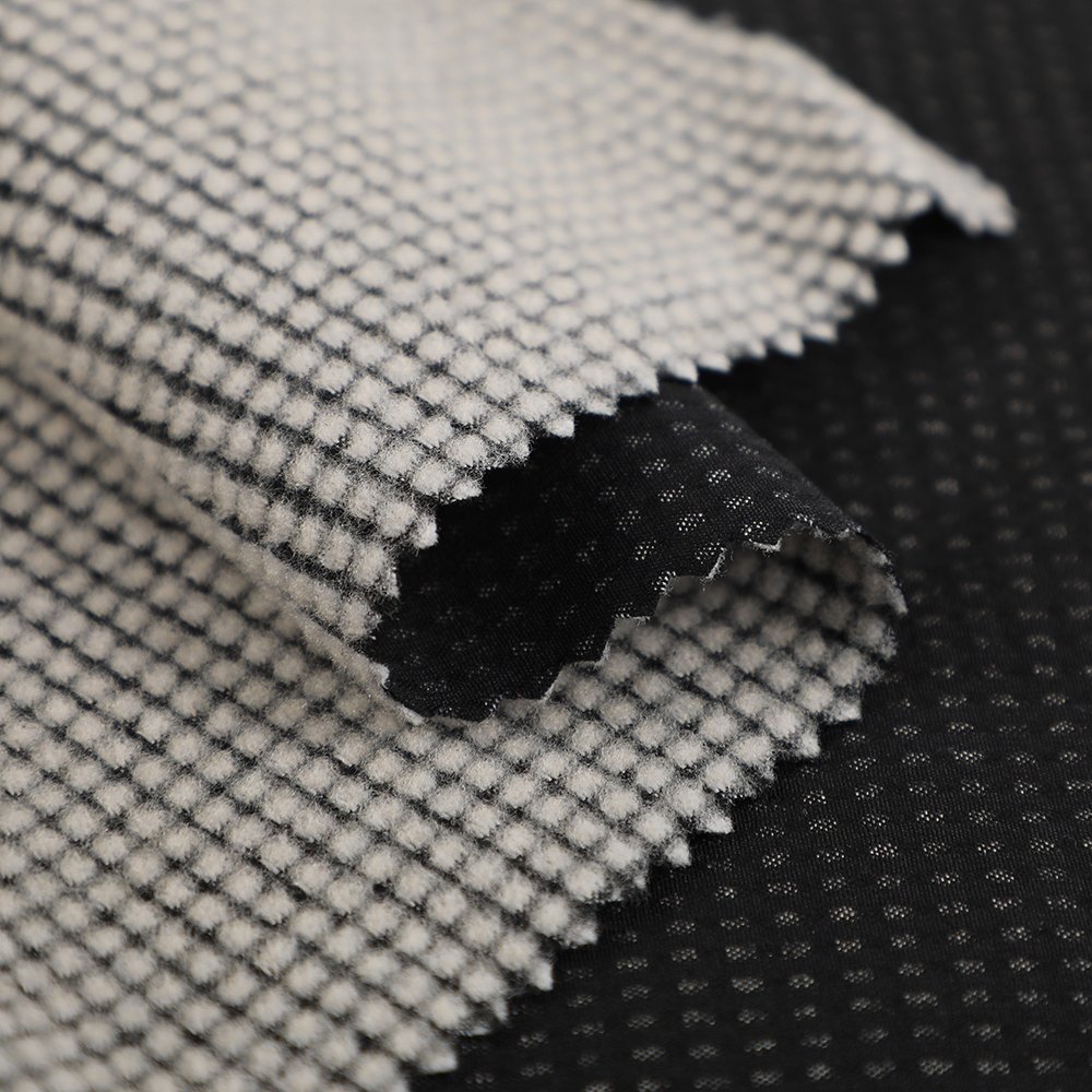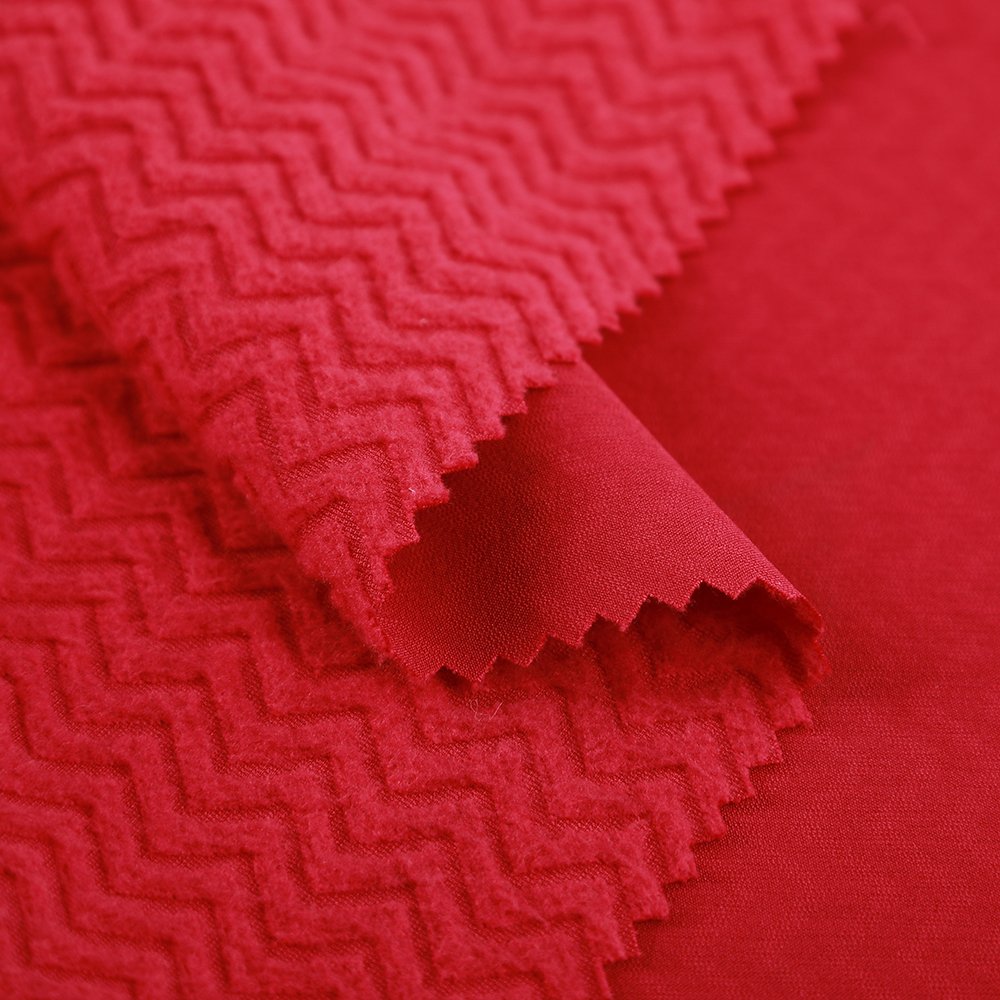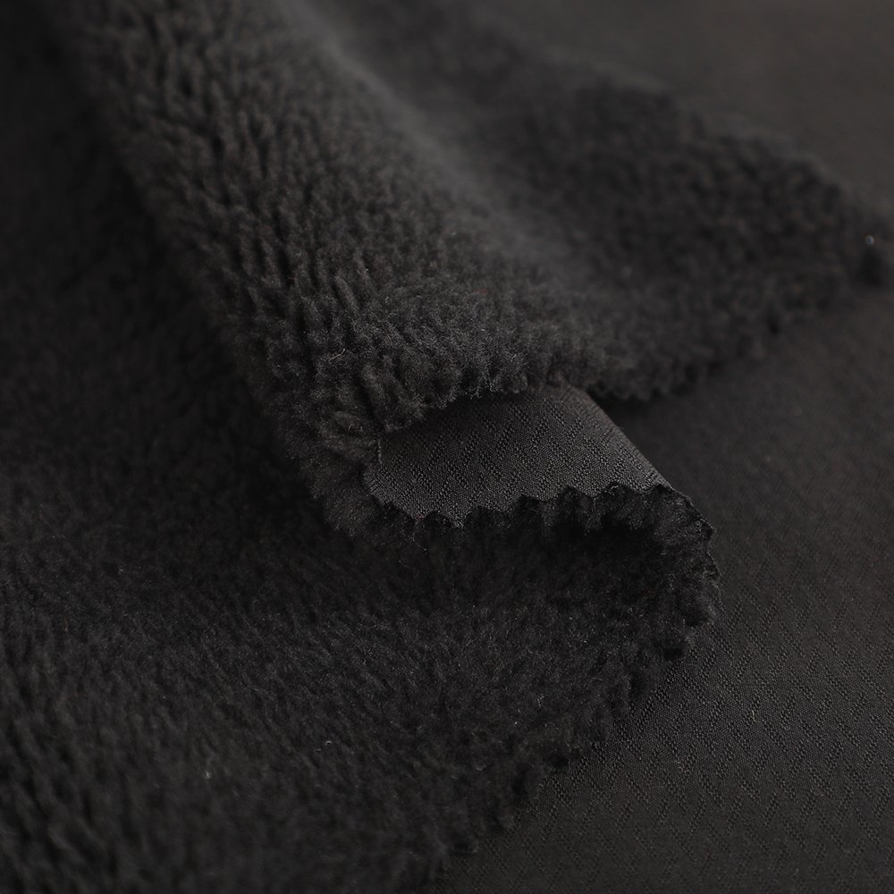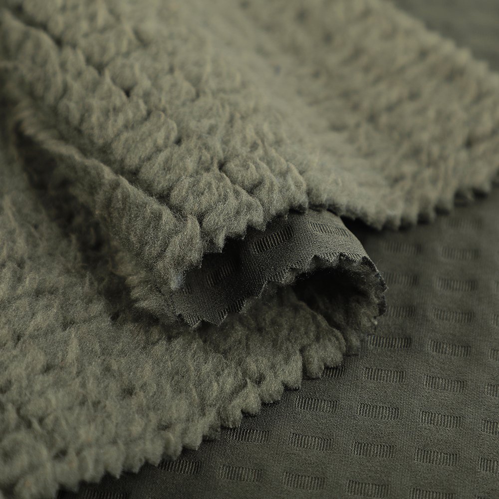 Jacquard Woven Fleece Fabric  An eco-friendly alternative to laminated fabrics, this one-piece woven fleece is created without glue. The jacquard surface offers rich texture, while the brushed fleece inside is soft and warm. It lacks full membrane waterproofing but provides basic water repellency, making it ideal for apparel that values comfort, breathability, and sustainability.